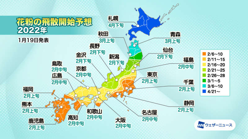 今年のスギ花粉は2月上旬から、ウェザーニューズ「第三回花粉飛散傾向」(2/5)