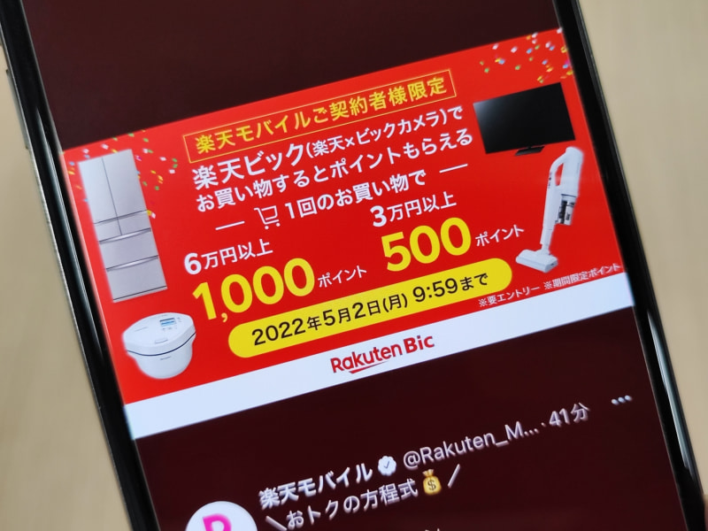 楽天ビック、楽天モバイル契約者が6万円以上の買い物で1000ポイント還元