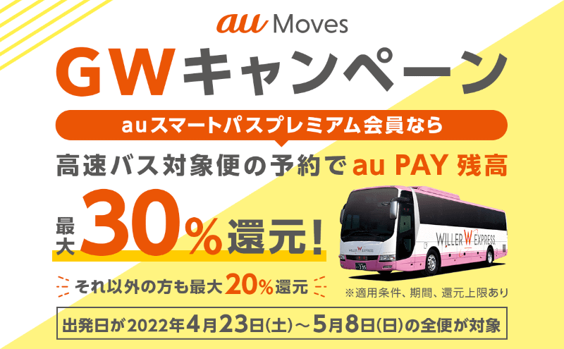 「au Moves 高速バス」で最大30%還元、ゴールデンウィークに利用できる