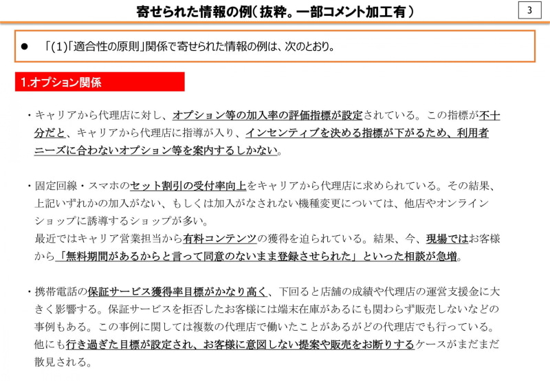 • 総務省WG「キャリアショップ覆面調査」での違反事例を紹介、「回線契約がないと売れない」「契約があると割引が上乗せできる」など