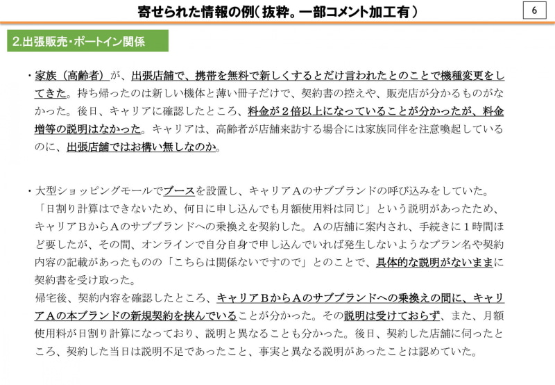 • 総務省WG「キャリアショップ覆面調査」での違反事例を紹介、「回線契約がないと売れない」「契約があると割引が上乗せできる」など