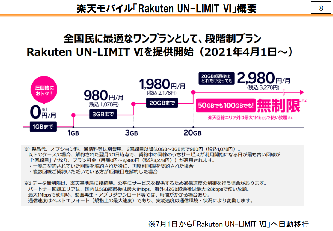 • 楽天モバイルが7月から新料金「Rakuten UN-LIMIT VII」、0円なくなり月額1078円~3278円、ポイント倍率はアップ