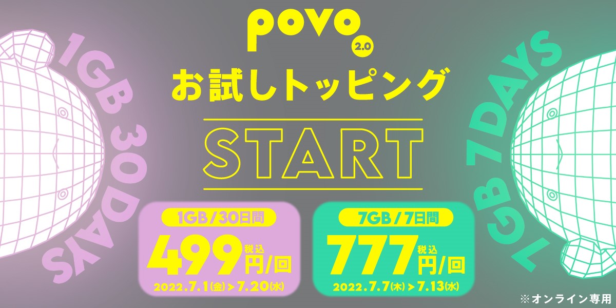 「povo2.0」の「お試しトッピング」、7GB(7日間)の提供は延期に