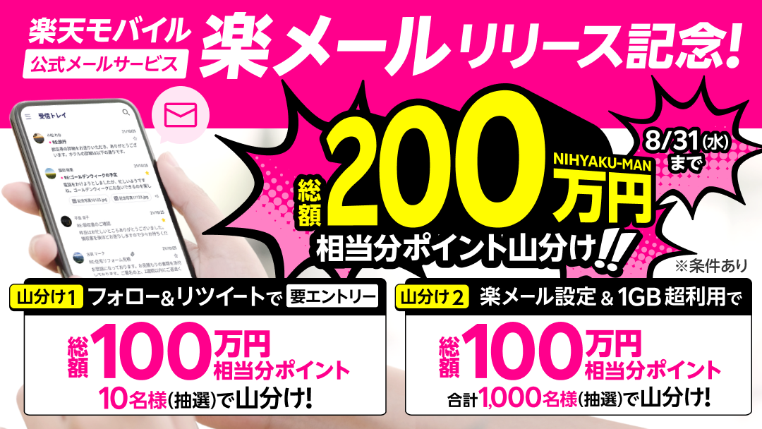 楽天モバイルの「楽メール」で障害、16日19時ごろ~【回復】