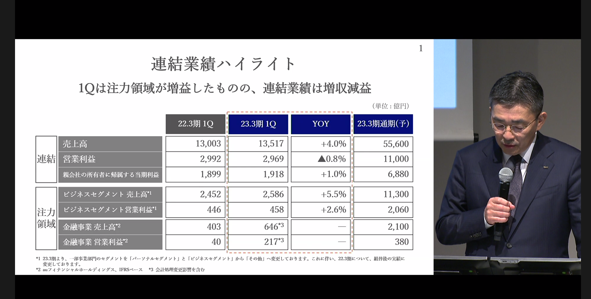 KDDIの23年3月期1Q決算は「増収減益」、金融など注力領域がけん引(2/9)