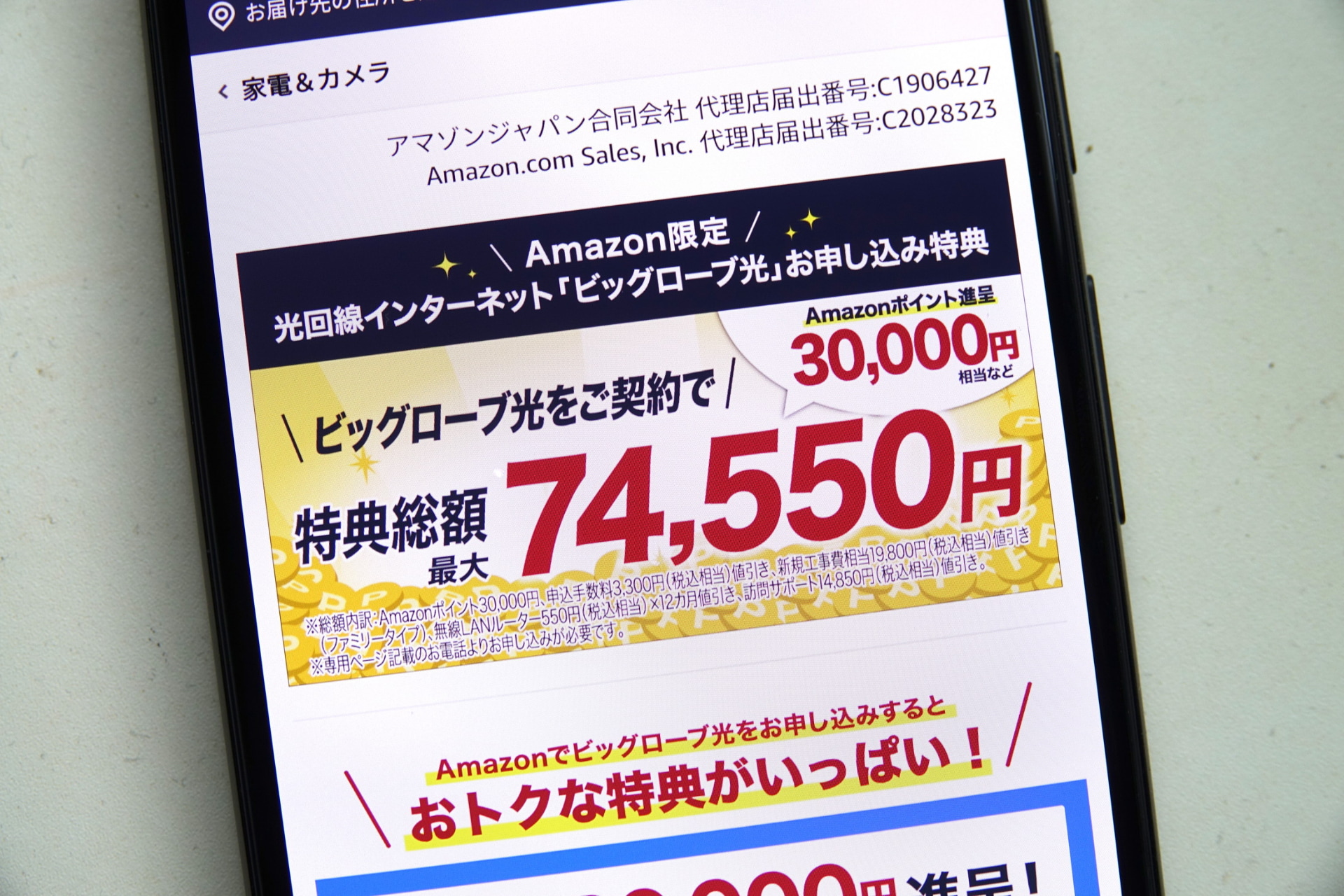 「ビッグローブ光」契約で3万円分のポイント還元、Amazon.co.jp
