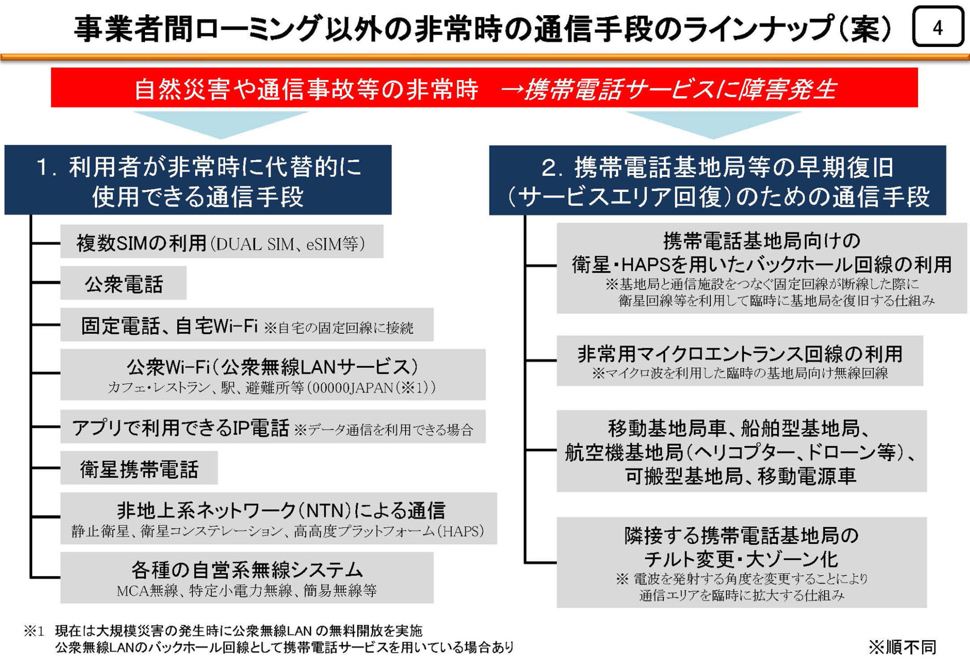 • 「非常時の事業者間ローミング」検討会の第4回、今回は“ローミング以外の手段”が焦点に