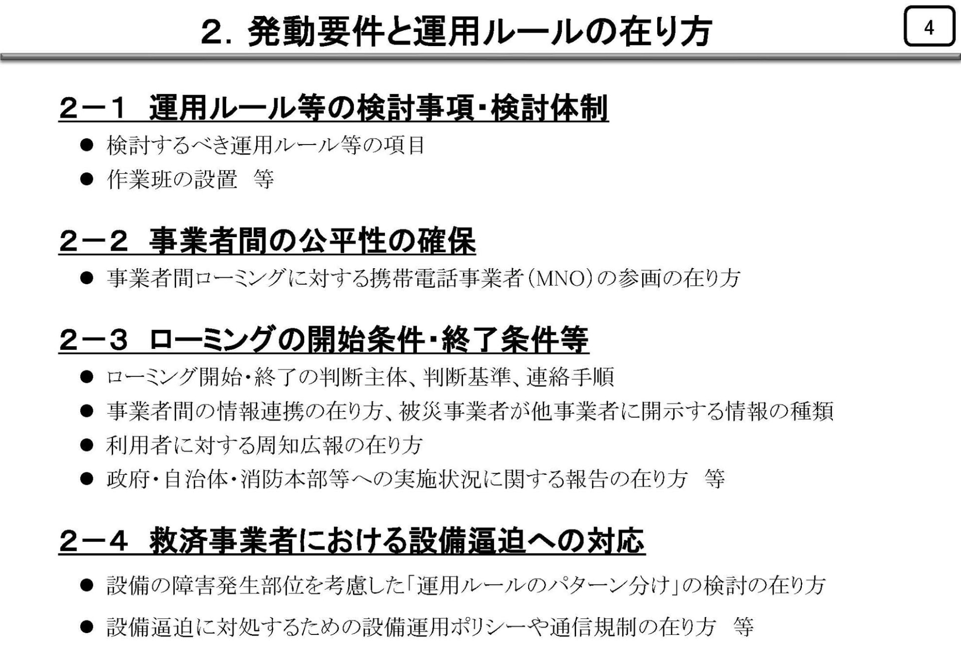 • 「非常時の事業者間ローミング」検討会の第4回、今回は“ローミング以外の手段”が焦点に