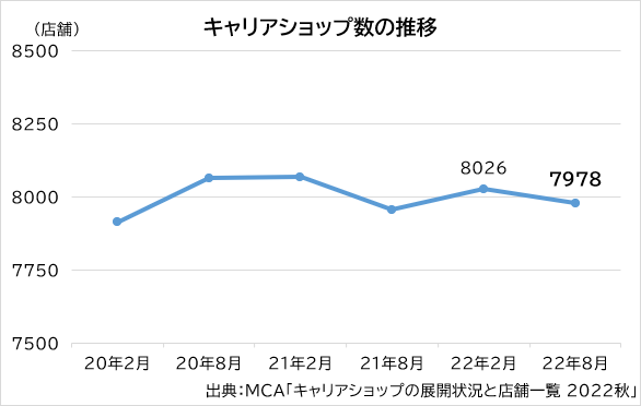 キャリアショップ数は全国7955店舗、半年前から112店減少し再び8000店の大台を割り込む