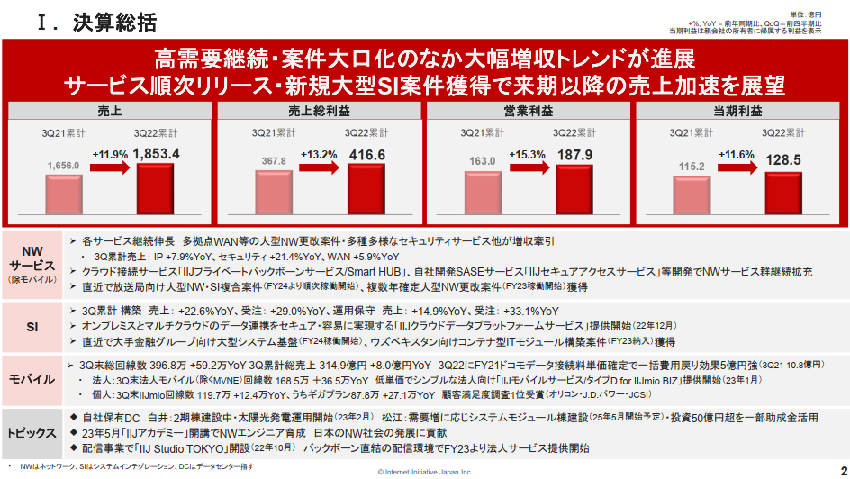 • IIJの2022年度は増収増益、「ギガプラン」の増量は市場の高評価得る
