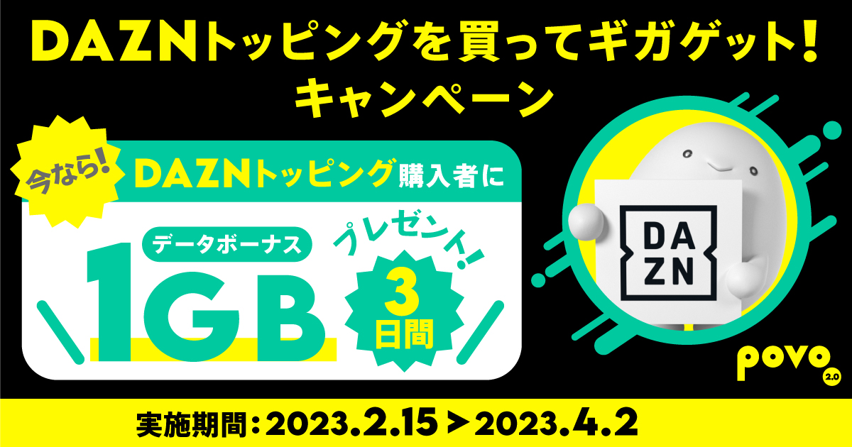 「povo2.0」の「DAZN使い放題パック(7日間)」が値上げ、3月1日から925円に