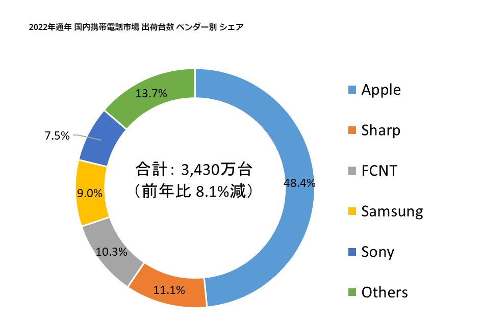 IDC調査、2023年の国内スマホ出荷台数は11.0%減、ベンダー別シェア1位は51.9%のアップル