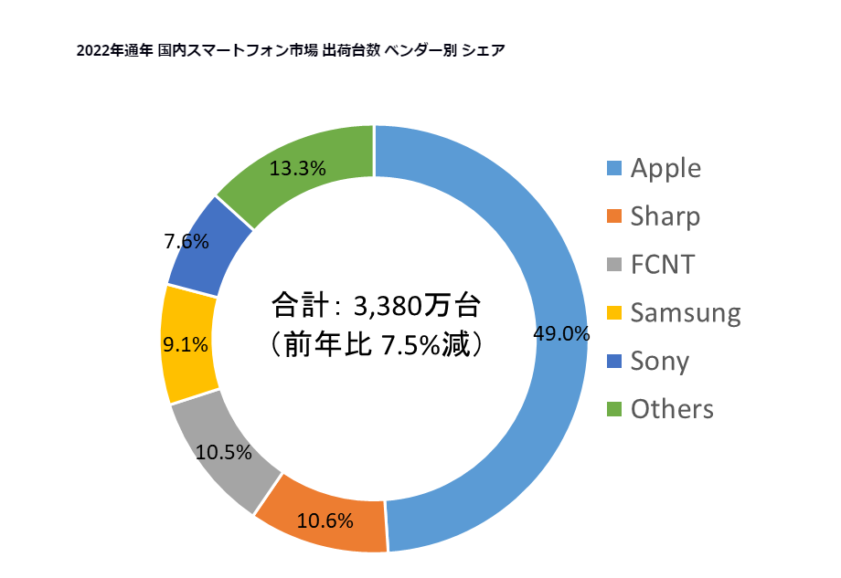 IDC調査、2023年の国内スマホ出荷台数は11.0%減、ベンダー別シェア1位は51.9%のアップル