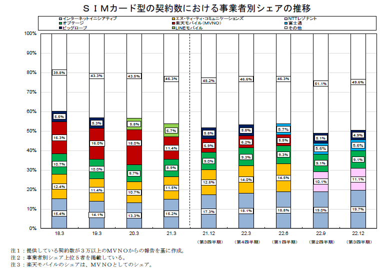 楽天モバイルのシェアは2.3%、MVNO内シェアはIIJが20%到達――総務省調査、6月末時点