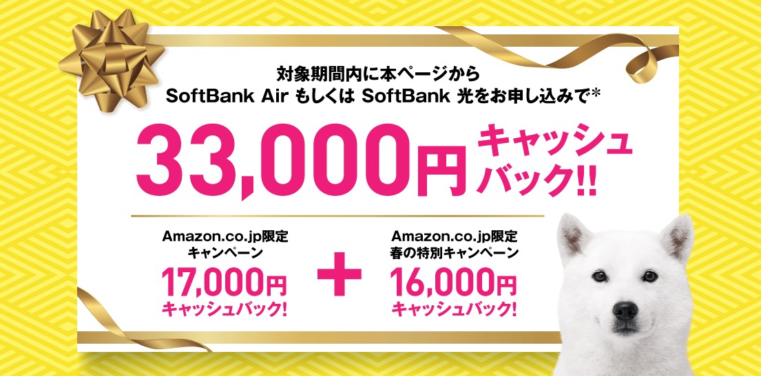 Amazonで「SoftBank Air/光」契約なら3.3万円キャッシュバック、3月31日まで