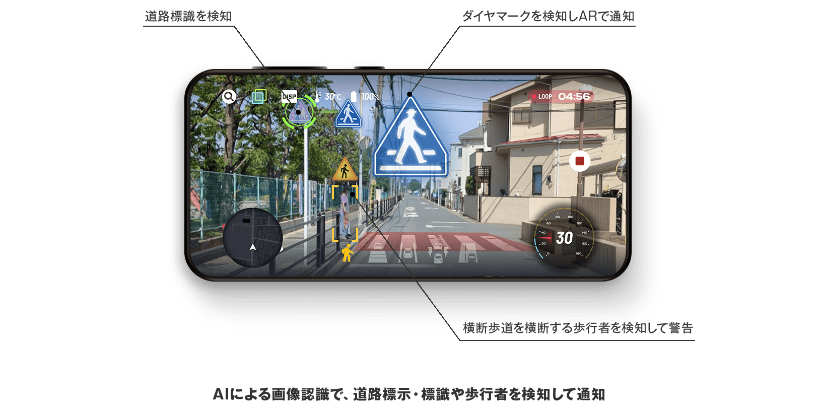 ドラレコアプリの「AiRCAM」、横断歩道や歩行者をAI検知、AR活用で注意を促す新機能