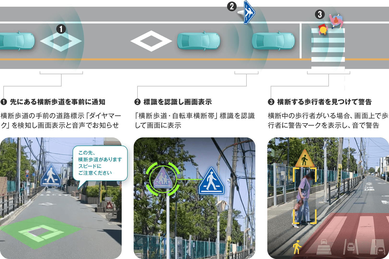 ドラレコアプリの「AiRCAM」、横断歩道や歩行者をAI検知、AR活用で注意を促す新機能