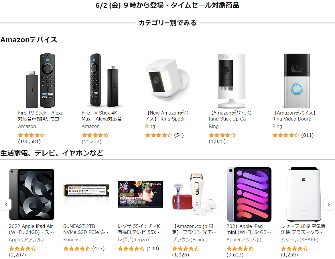Amazonで購入(先行セールの予告商品):「Fire TV Cube」「Anker 622 Magnetic Battery(MagGo)」「Security SmartTrack Card」 Amazonで購入(2日9時開始、タイムセール祭りの予告商品):「Fire TV Stick」「Fire TV Stick 4K Max」「Ring Spotlight Cam Plus, Battery」「iPad Air(第5世代)」(Wi-Fiモデル、64GB)「iPad mini(第6世代)」(Wi-Fiモデル、64GB)「AirPods(第3世代)」 「タイムセール祭り」Amazonで購入