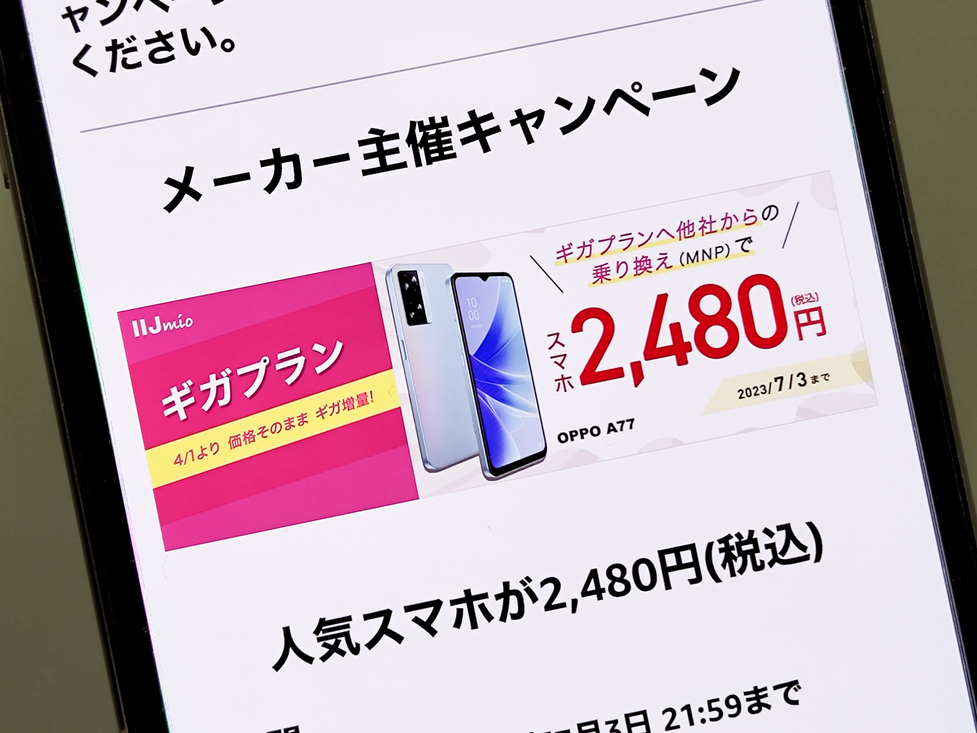 IIJmioでMNP向け「スマホ大特価セール」、「OPPO A77」が980円など