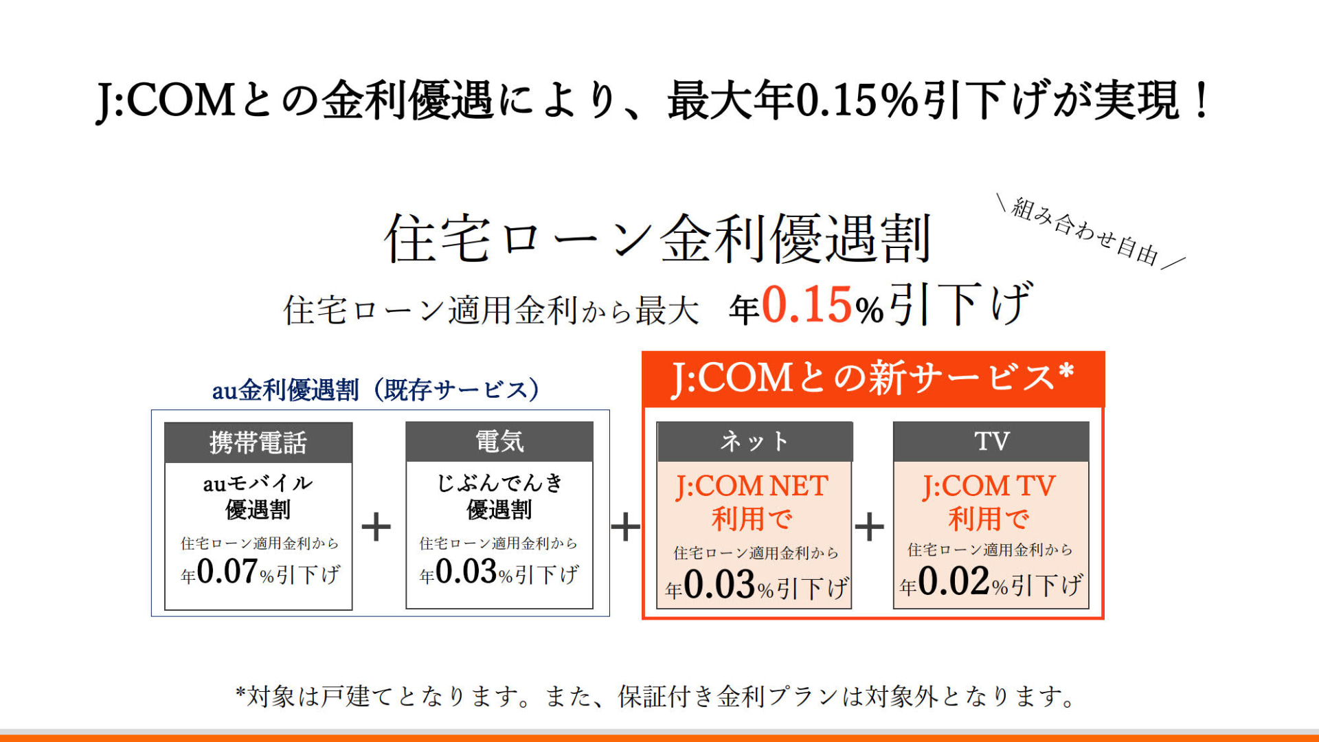auじぶん銀行、JCOMのサービス利用で住宅ローン金利を年0.05%引き下げへ――最大年0.15%引き下げも可能(2/15)