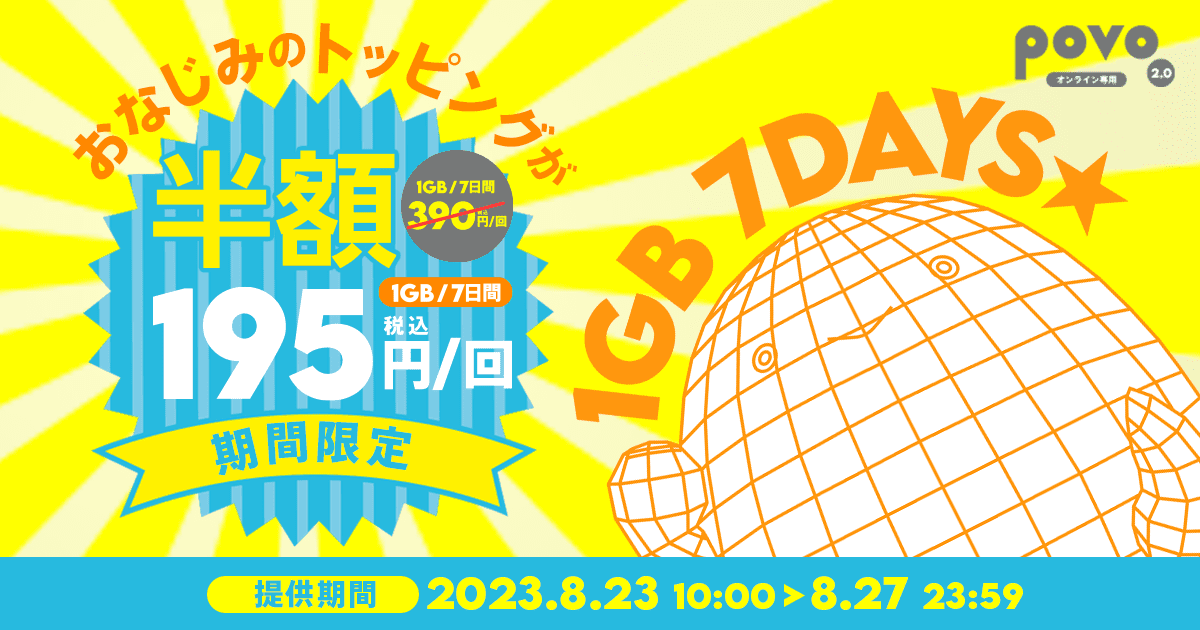 povoの「120GB/365日」期間限定トッピング、10月末まで購入可能に
