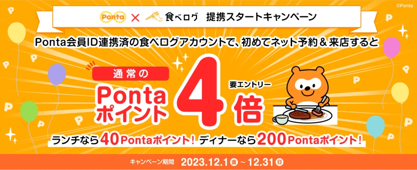 「食べログ」でPontaポイントが最大4倍貯まるキャンペーン、ディナー予約なら1人あたり200ポイント