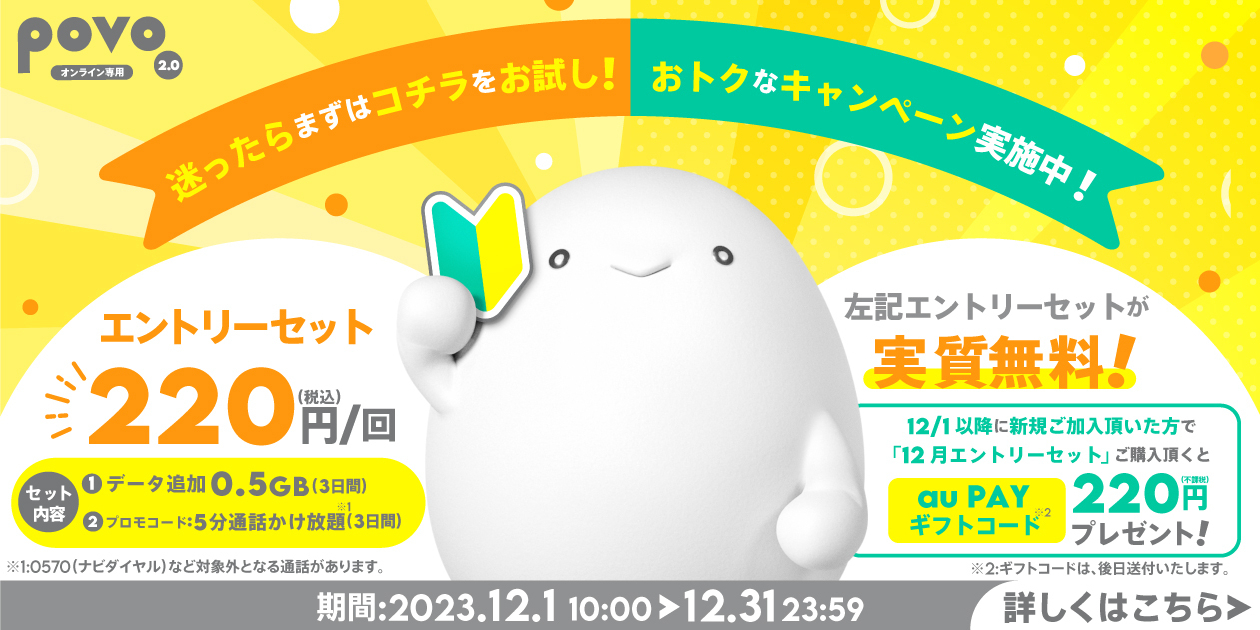 povo「データ使い放題購入で、もう1つもらえる」キャンペーン開催、3日まで