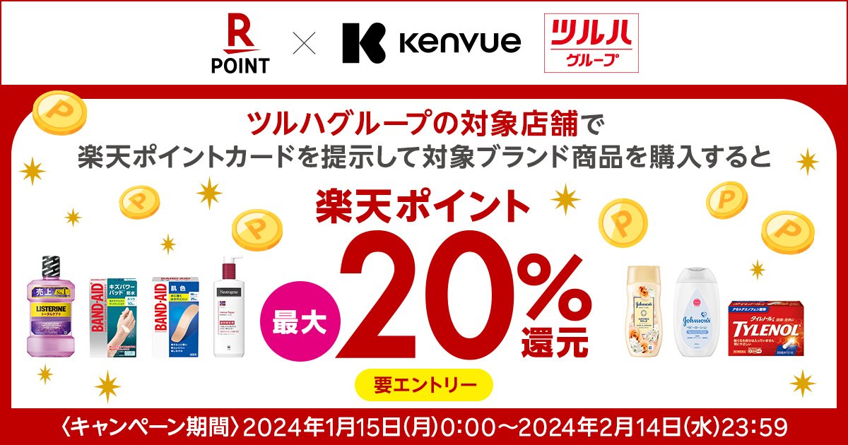 楽天ポイントカード提示で「リステリン」など最大20%還元、ツルハドラッグなどで2月14日まで