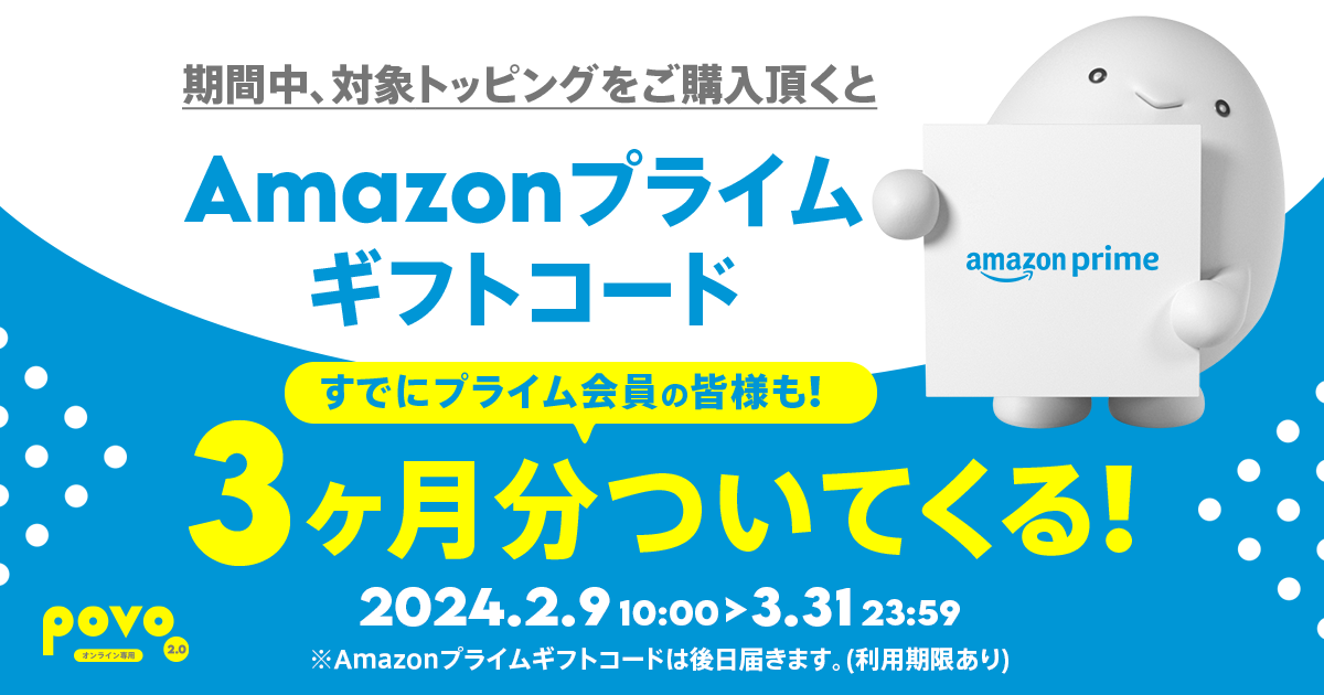 povo2.0、1万円以上のトッピング購入でAmazon プライム3カ月が無料に