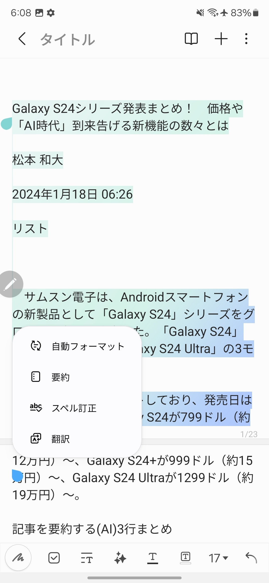 「Galaxy S24 Ultra」の“AI要約・翻訳”機能を試してみる(12/14)