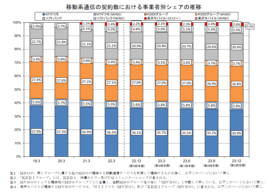 • 楽天モバイルのシェアは0.1ポイント減の2.2%、総務省調査