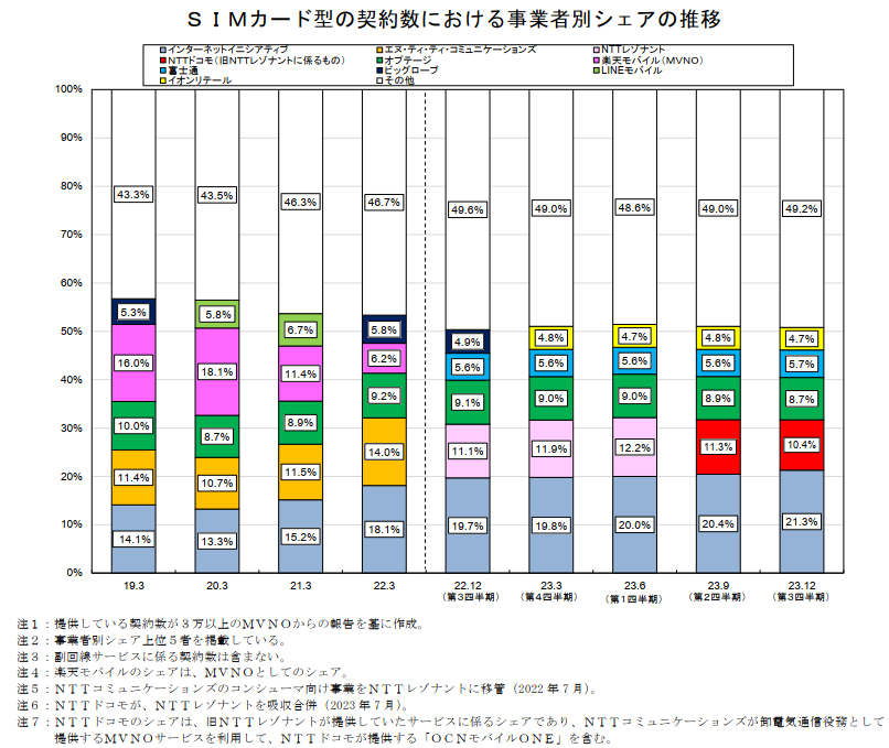 楽天モバイルのシェアは2.3%、MVNO内シェアはIIJが20%到達――総務省調査、6月末時点