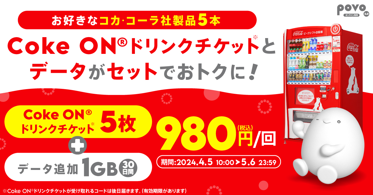 povo、「Coke ON」ドリンクチケットがセットになったトッピングを期間限定で提供