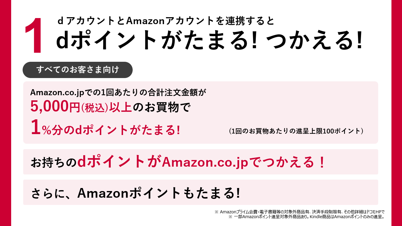 • ドコモのdアカウントとAmazonアカウント、「初めて連携→Amazonで初めて買い物」なら10%還元