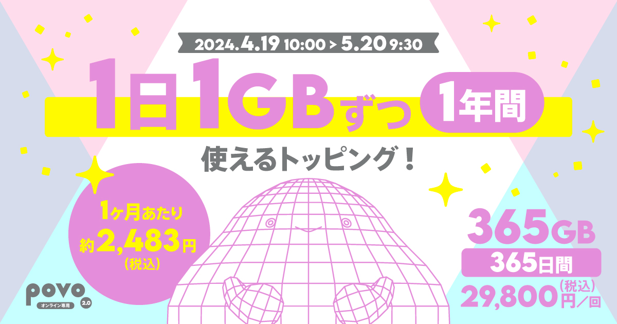 povo、「132GB/365日」「30GB/180日」「1GB/365日」の期間限定トッピング
