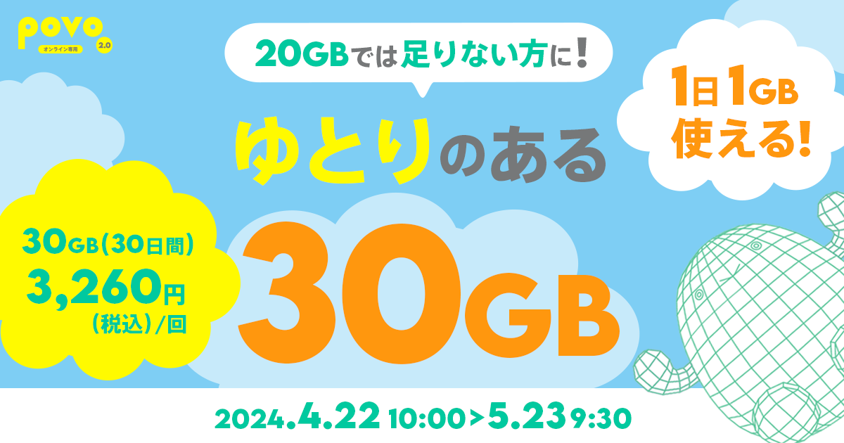povoで「データ使い放題(7日間)12回分」と「データ追加300GB(90日間)」が登場、1カ月あたり3278円