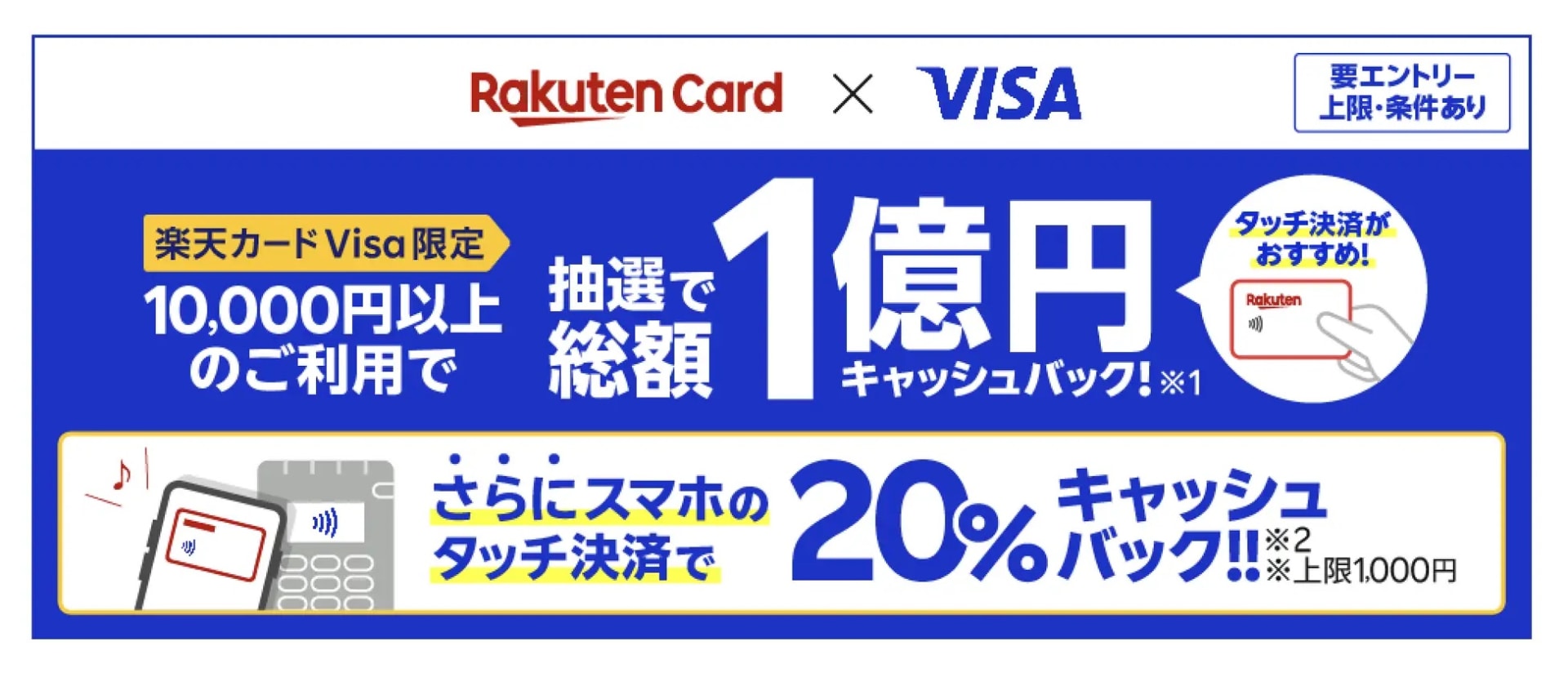 「楽天カード Visa」、スマホのタッチ決済で20%還元、抽選で1万円キャッシュバックも