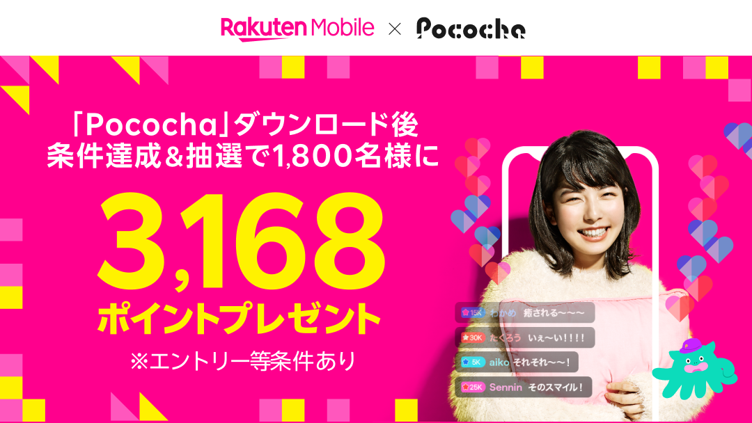 楽天モバイル、「Pococha」ダウンロード&条件達成で3168ポイントが当たる
