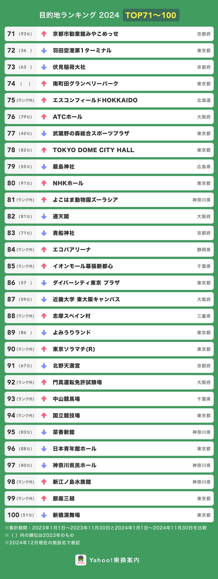 ヤフー、「Yahoo!乗換案内」で検索された「目的地ランキング 2024」を発表(5/8)