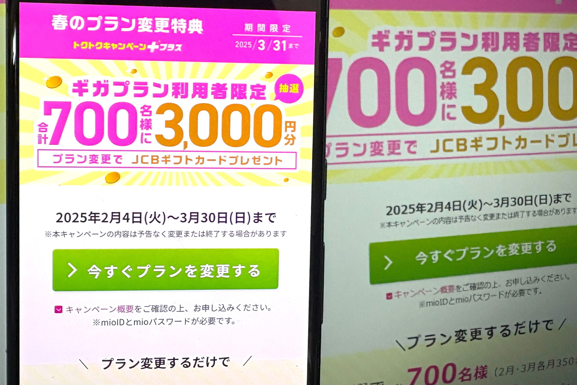 IIJmioの「ギガプラン」が半年間最大500円割引など「トクトクキャンペーン+【SIM特典】」、3月末まで