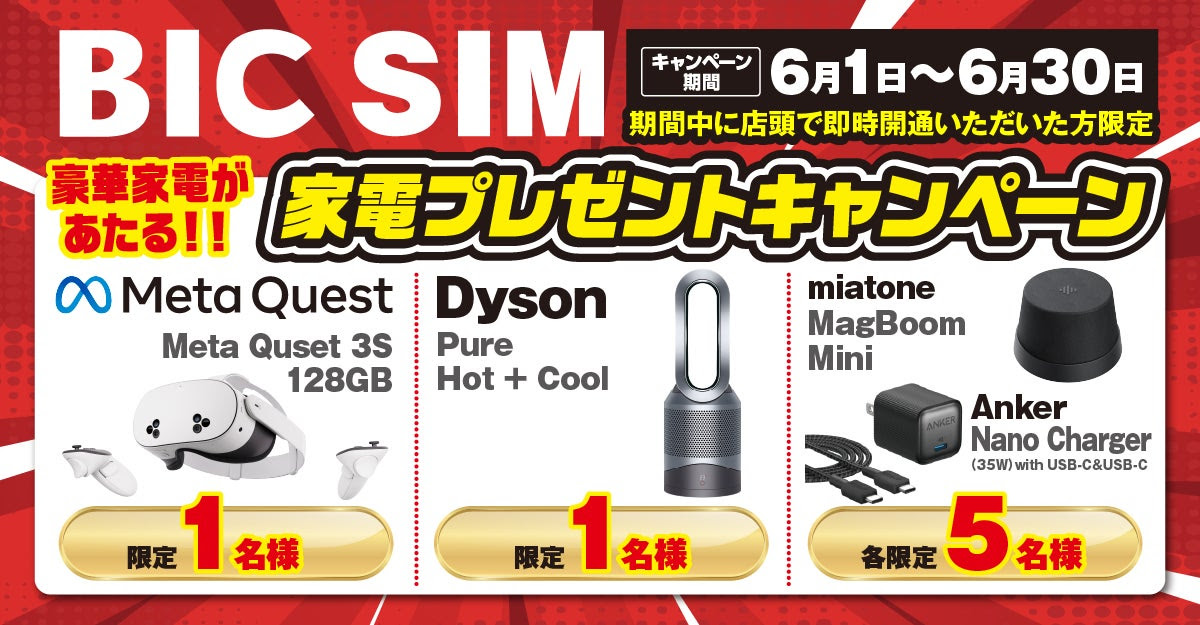BIC SIMの店頭申込で最大1万6500円分の特典 抽選で家電プレゼントも