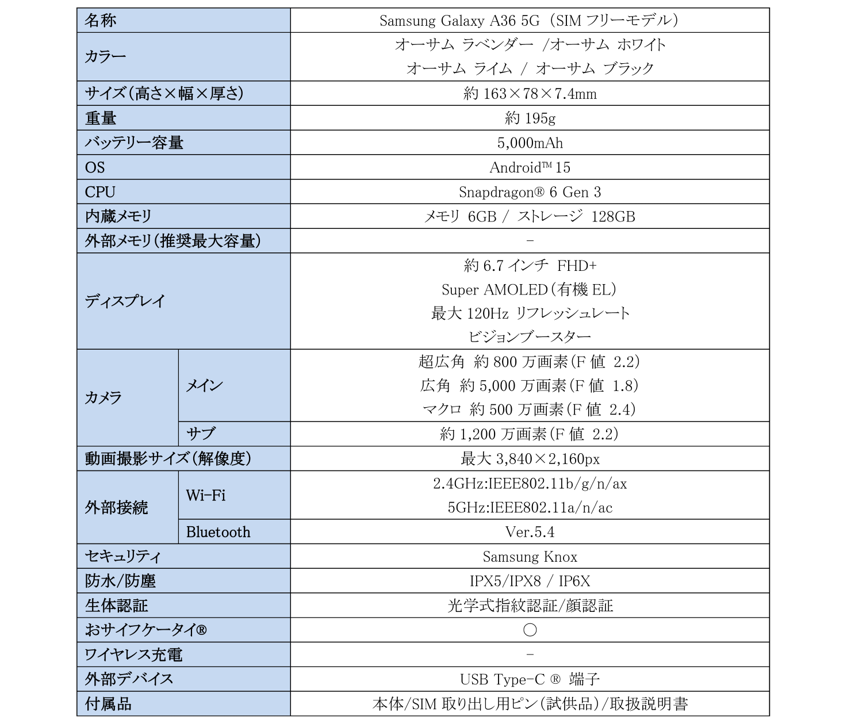 • ドコモ、「Galaxy A36 5G SC-54F」を6月26日発売
