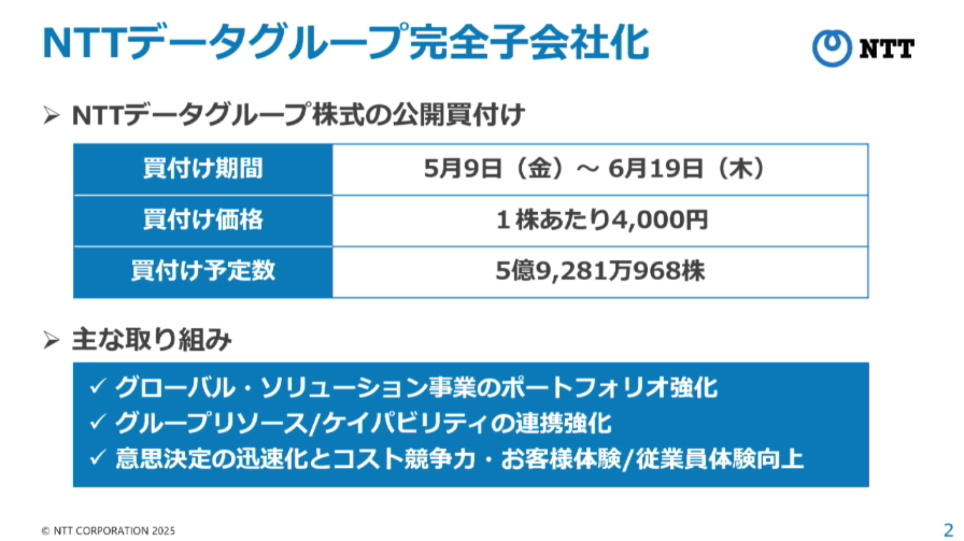 • NTT(持株)、NTTデータを完全子会社化へ 約2.3兆円規模
