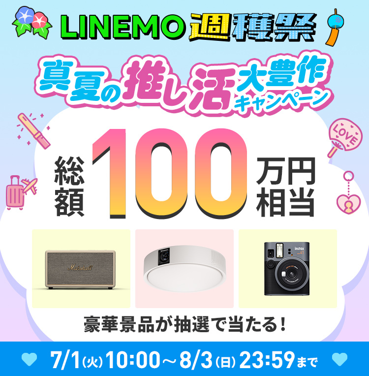 7月の「LINEMO 週穫祭」、総額100万円分の“推し活”アイテムが抽選で当たる(2/11)