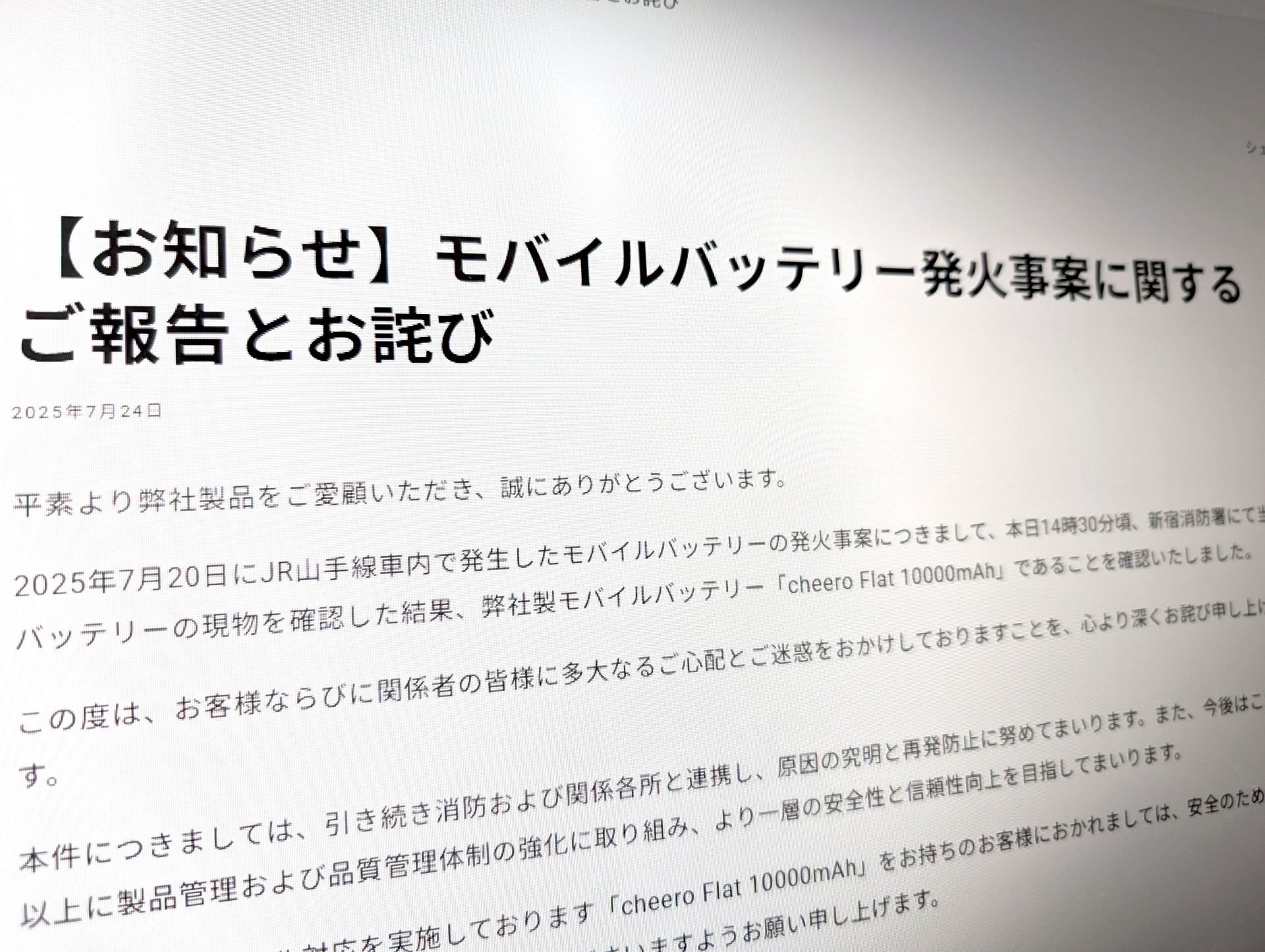 モバイルバッテリー「cheero Flat 10000mAh」が回収、発煙や焼損のおそれ