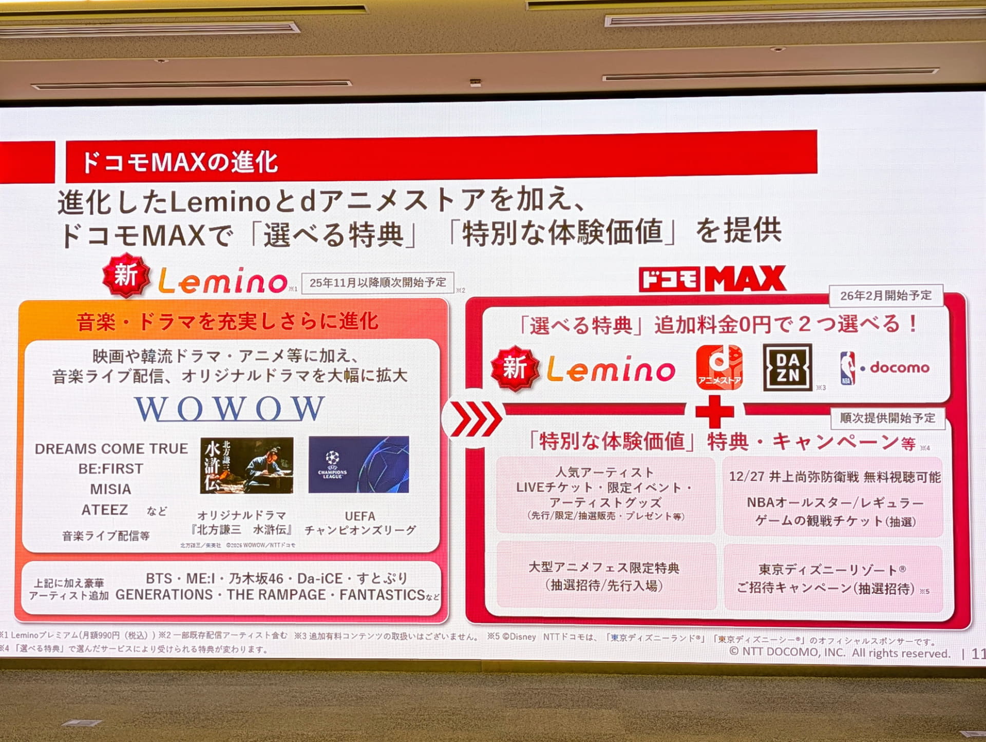 • 「ドコモ MAX」の映像特典が26年2月から選択制「選べる特典」に、DAZN・NBA・Lemino・dアニメストアから