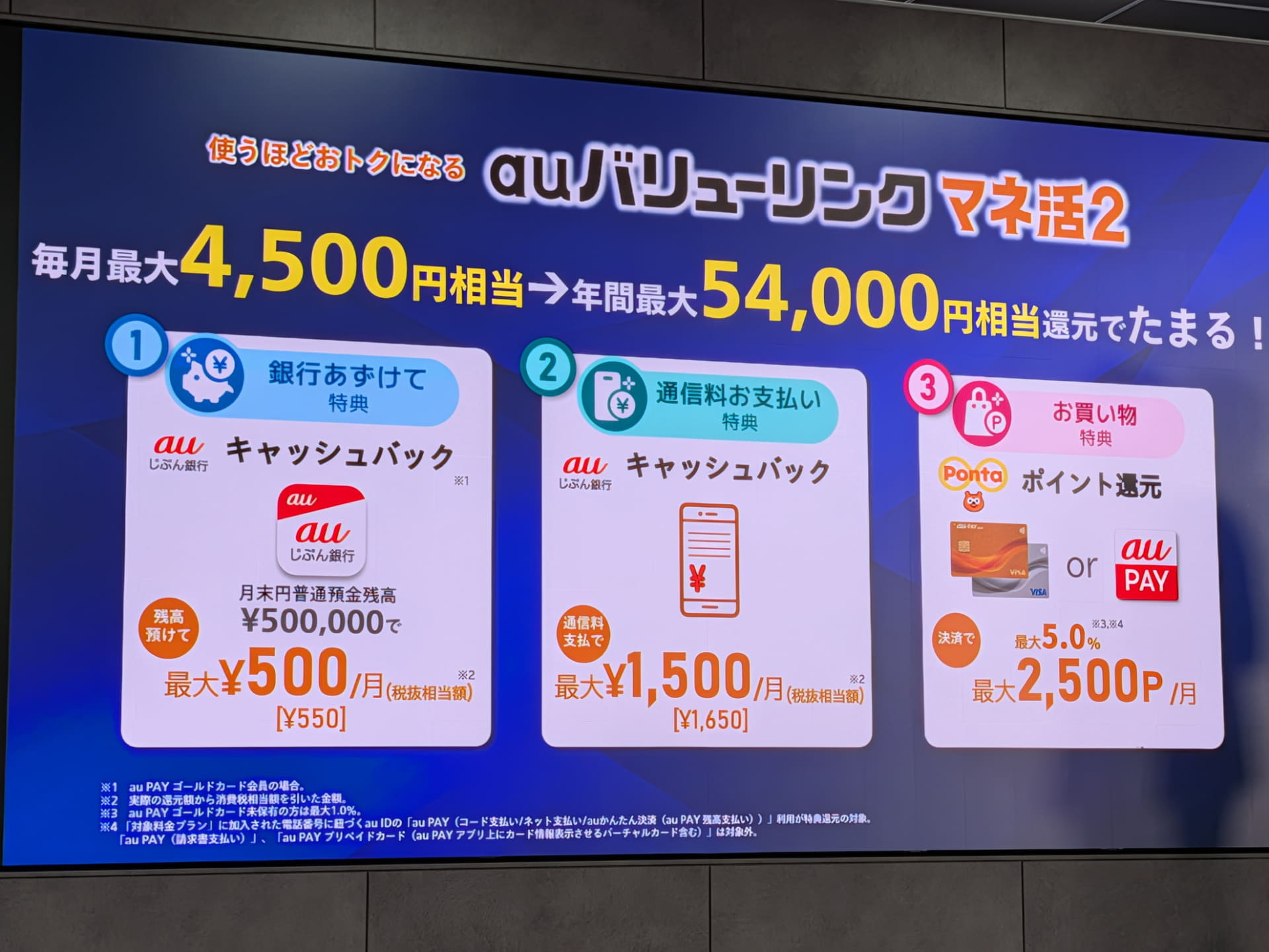 • auが新料金プラン「マネ活2」発表、auの銀行・クレカ利用で最大4700円相当を還元