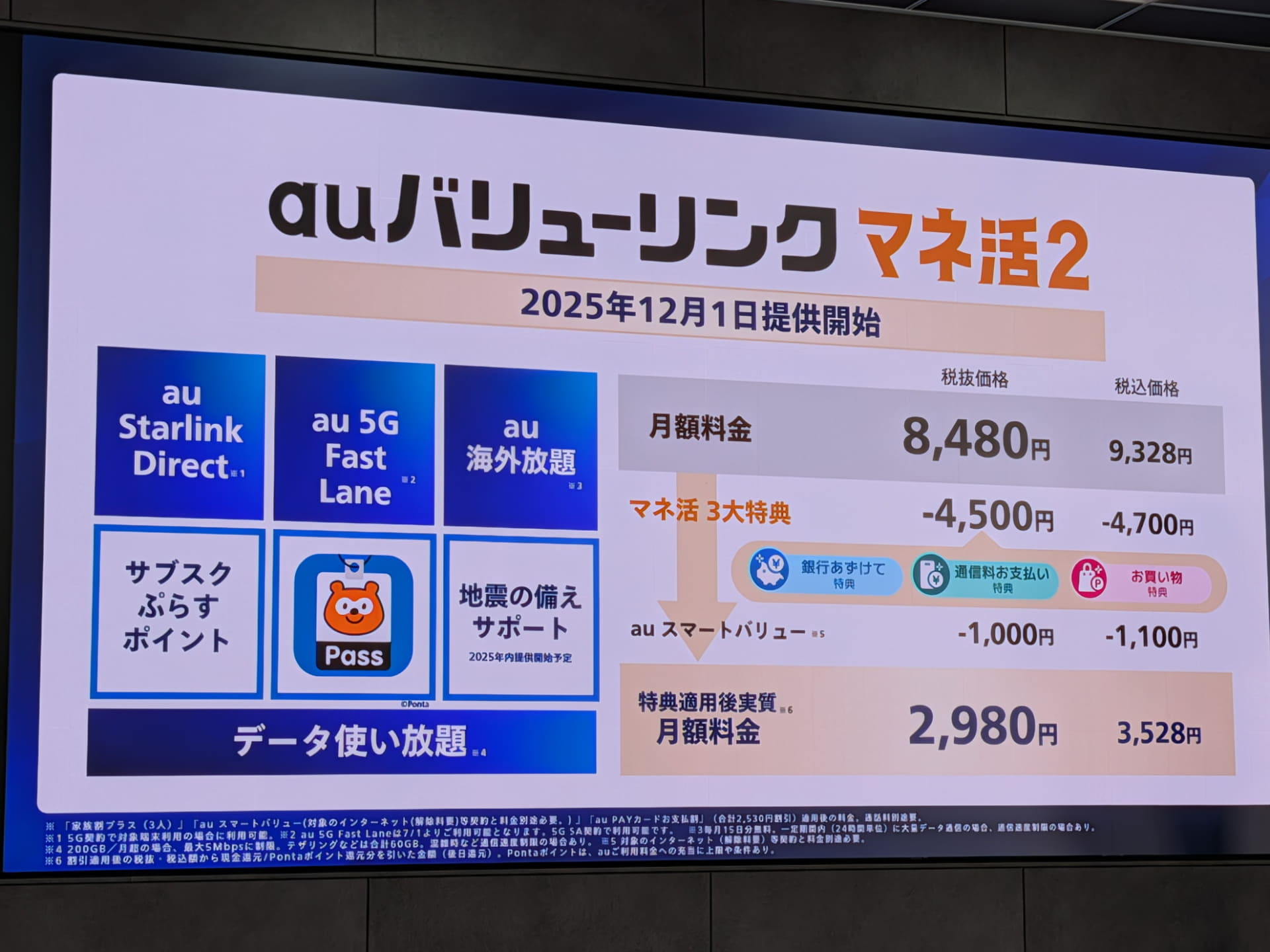 • auが新料金プラン「マネ活2」発表、auの銀行・クレカ利用で最大4700円相当を還元
