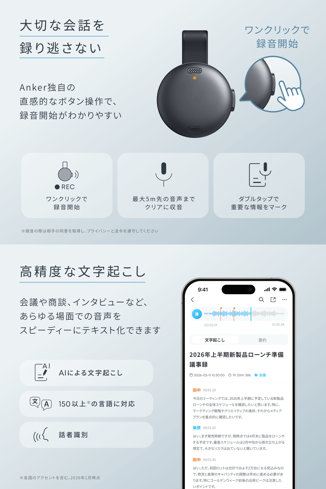 AnkerからAIボイスレコーダー「Soundcore Work」が発売、世界最小でAI文字起こしや要約(9/16)