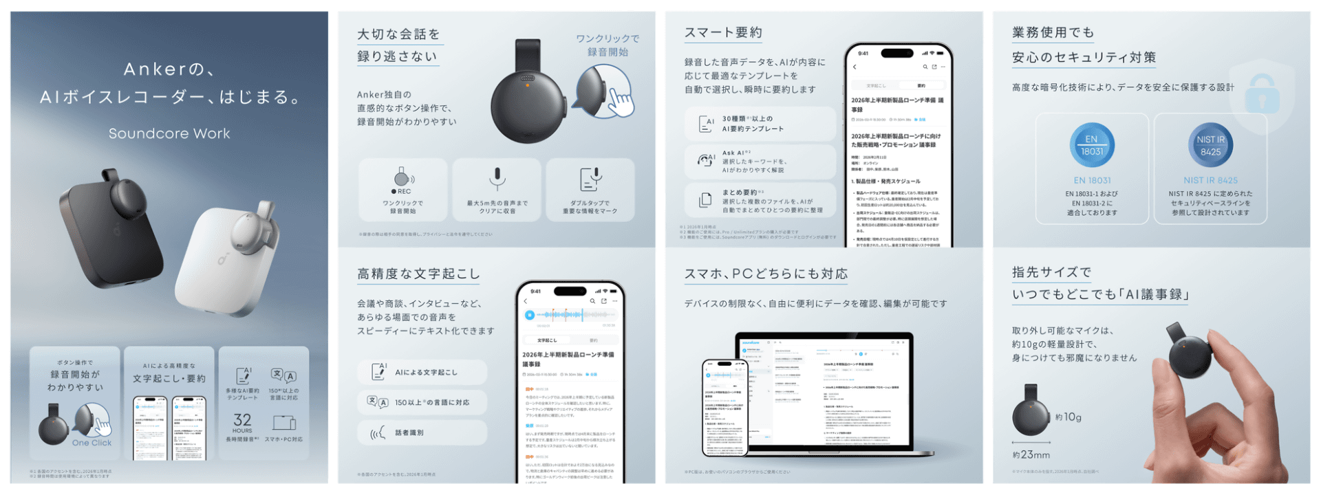 AnkerからAIボイスレコーダー「Soundcore Work」が発売、世界最小でAI文字起こしや要約(14/16)